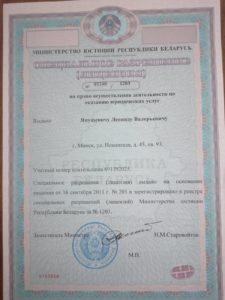 Специальное разрешение (Лицензия) выдано на основании решения от 16 сентября 2011г. №203 и зарегистрировано в реестре специальных разрешений (Лицензий) Министерства юстиции Республики Беларусь за №1203.